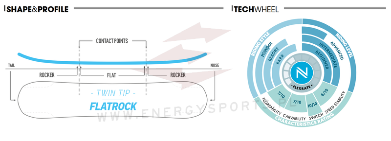 - Flatrock Profile - Flatrock to trójfazowa konstrukcja z camberem. Jest płaski między wiązaniami z większym rockerem z przodu i z tyłu. Rezultatem jest deska, która pozostaje w miejscu na oblodzonych powierzchniach, unosi się jak katamaran w puchu i sprawia, że triki to spacer po parku.