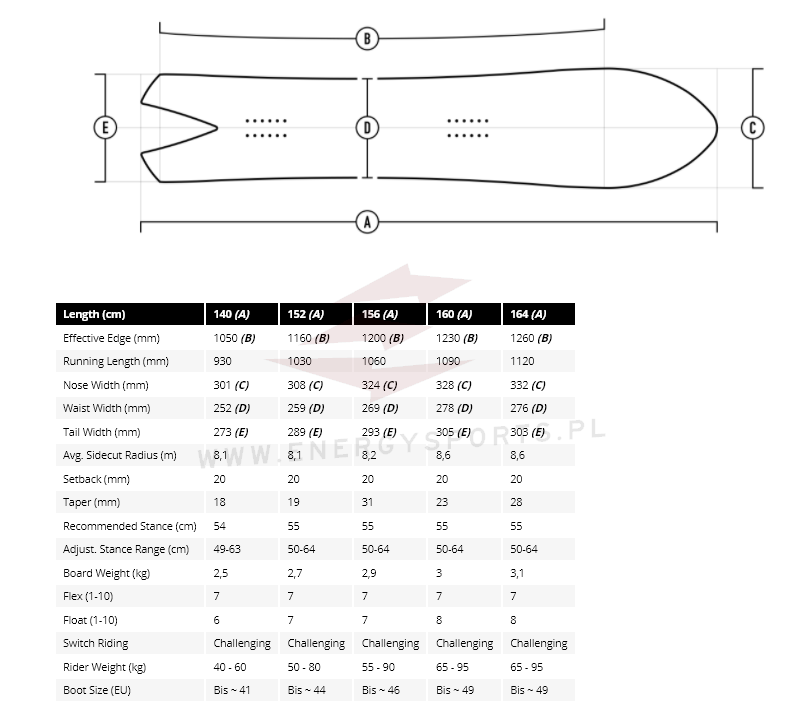 - Profil: Camber-to-rocker – klasyczny camber pod stopami dla stabilności, z delikatnym rockerem w strefach noska i ogona.